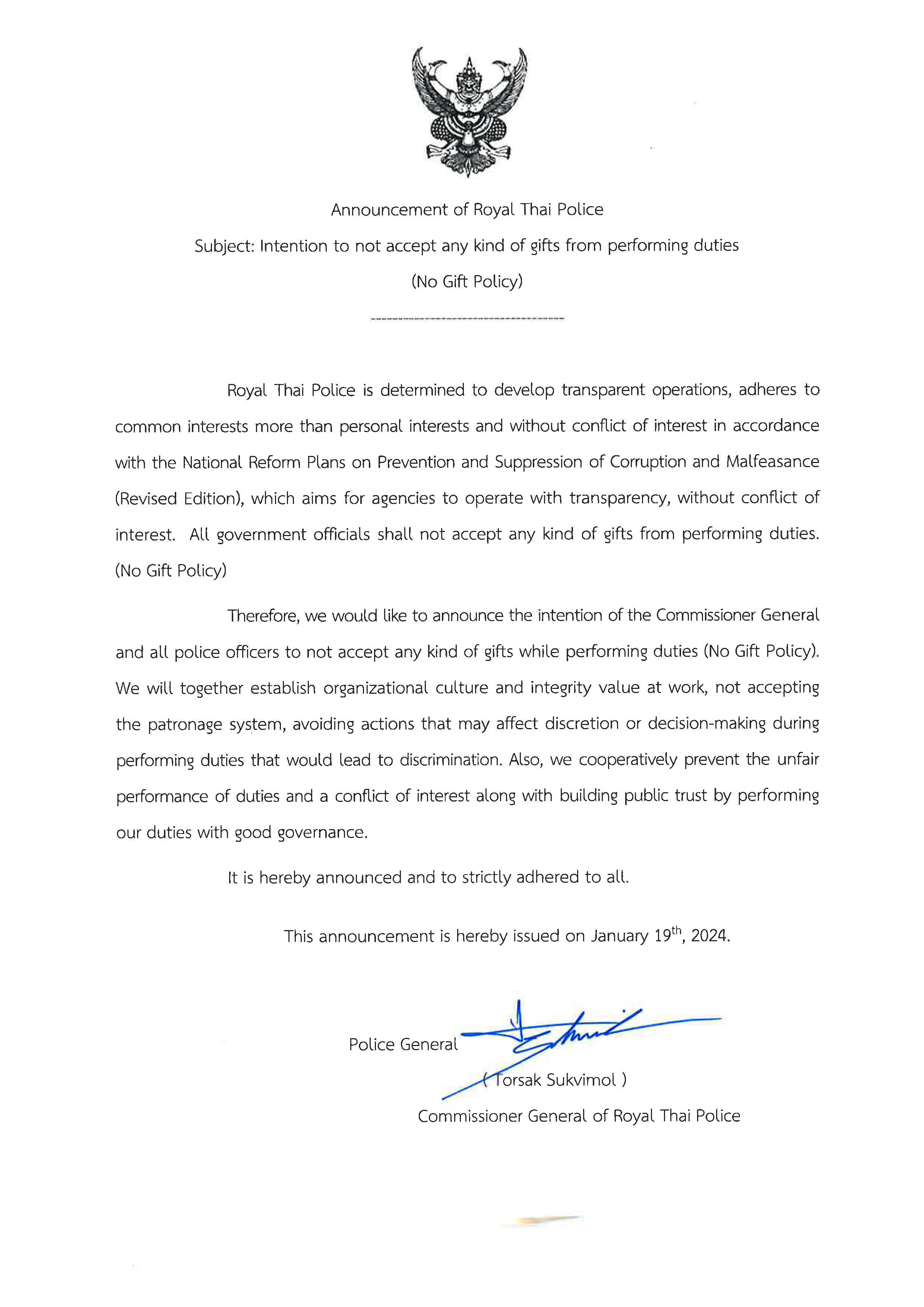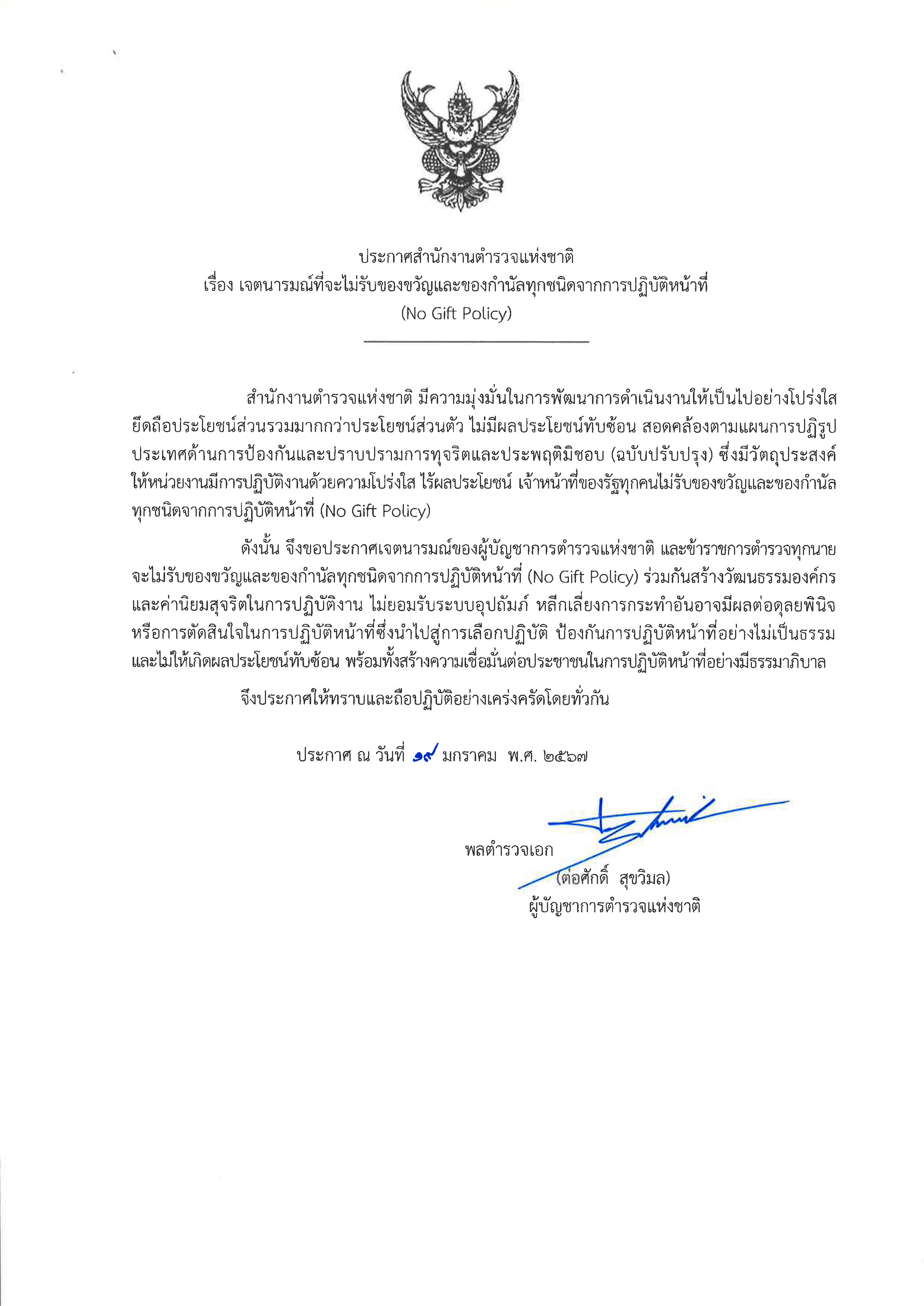 ประกาศเจตนารมณ์ที่จะไม่รับของขวัญหรือของกำนัลทุกชนิดจากการปฏิบัติหน้าที่