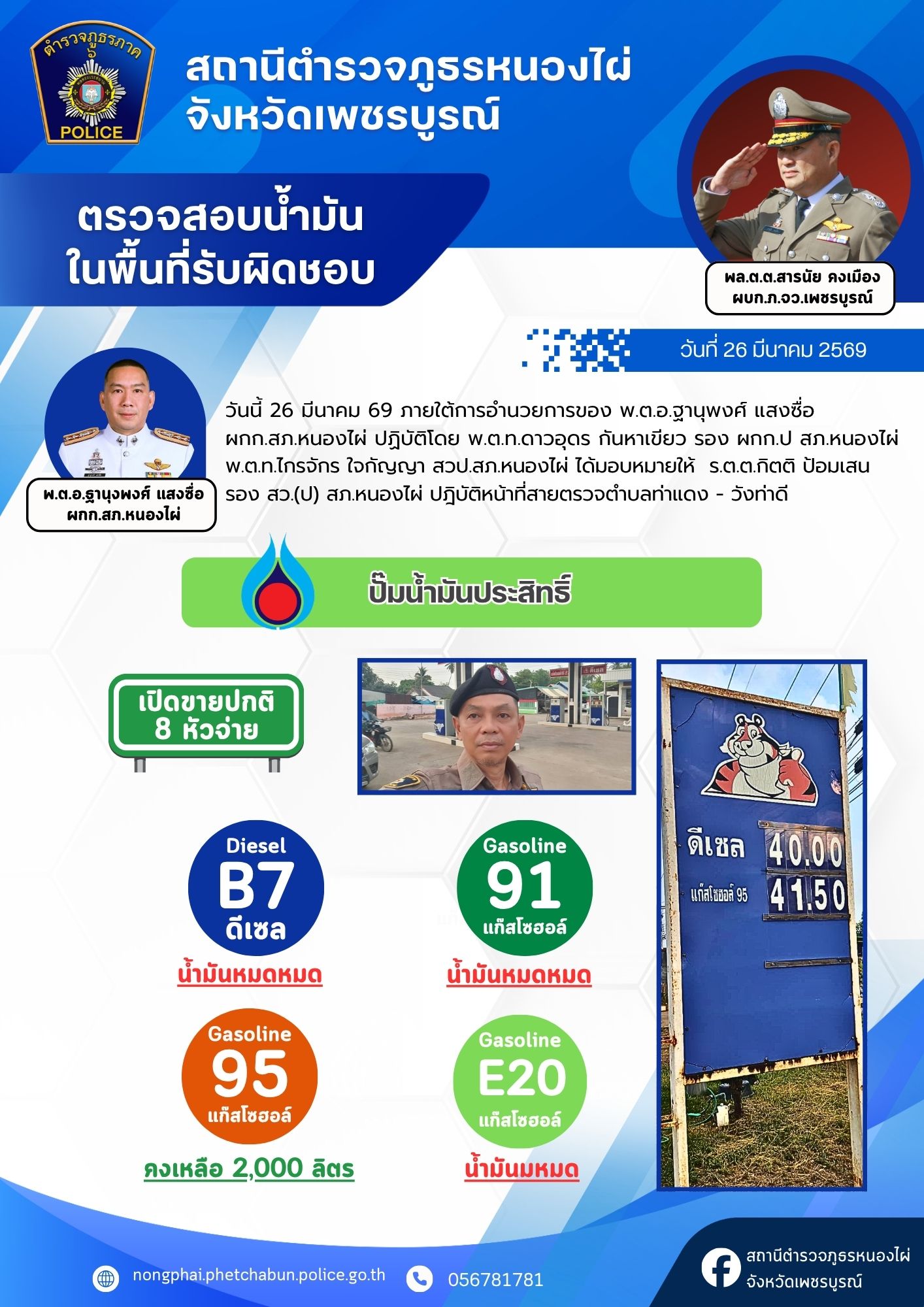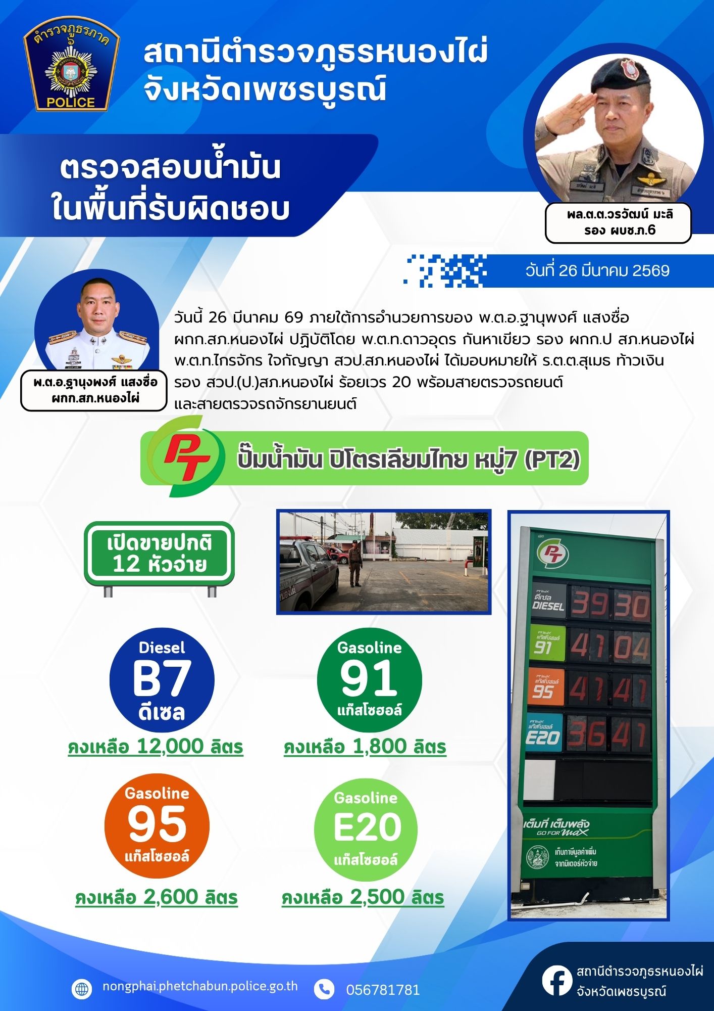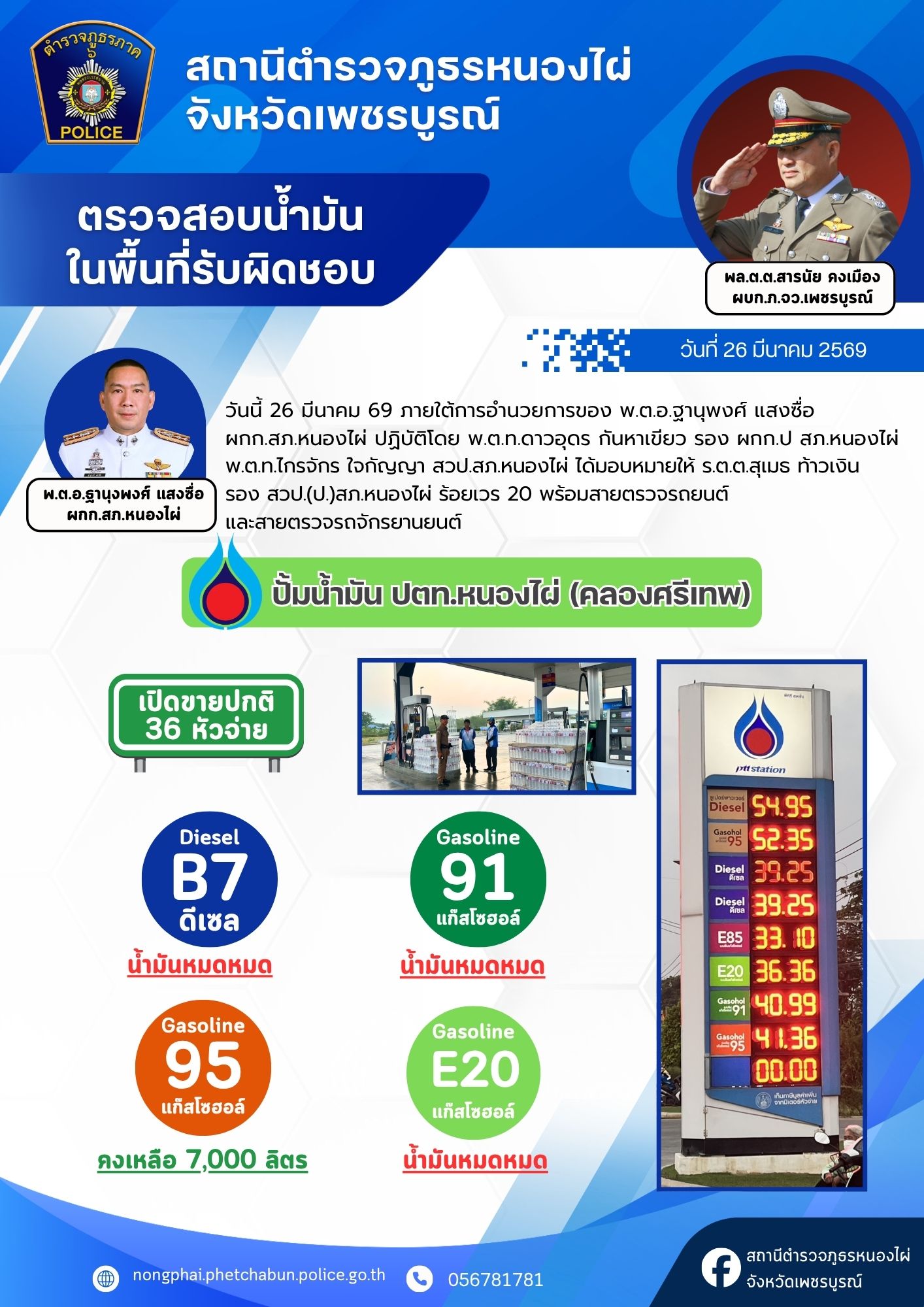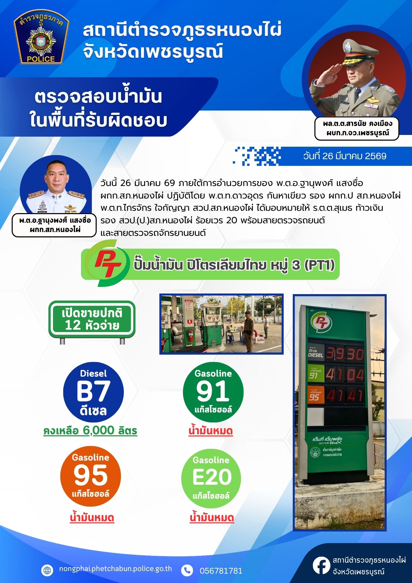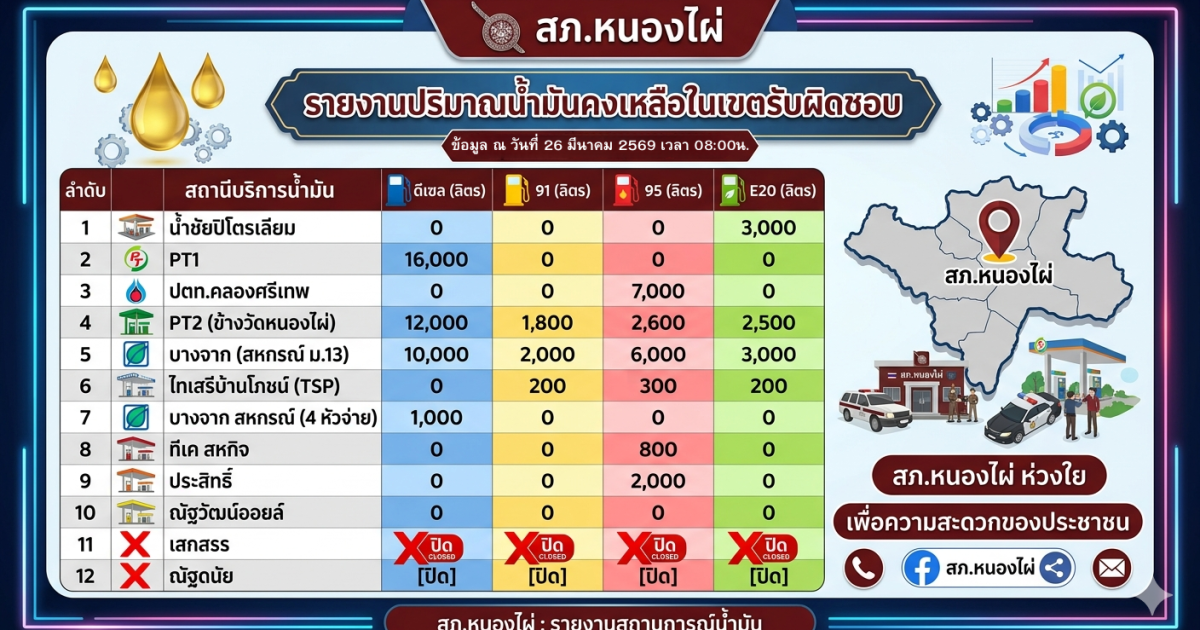ด้วยความห่วงใยในการเดินทางของพ่อแม่พี่น้องประชาชน สภ.หนองไผ่ ได้รวบรวมข้อมูลปริมาณน้ำมันคงเหลือจากสถานีบริการน้ำมันในเขตรับผิดชอบ เพื่อให้ทุกท่านสามารถวางแผนการเดินทางและสำรองเชื้อเพลิงได้อย่างสะดวกครับ