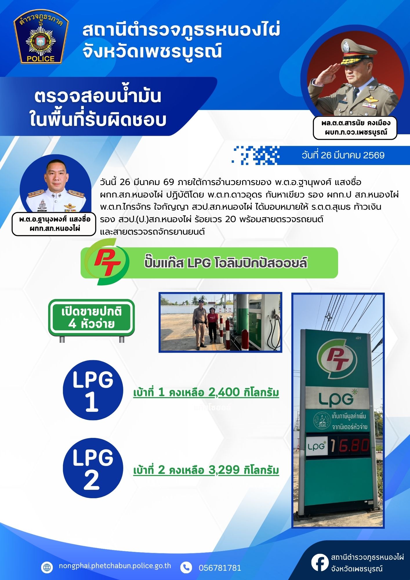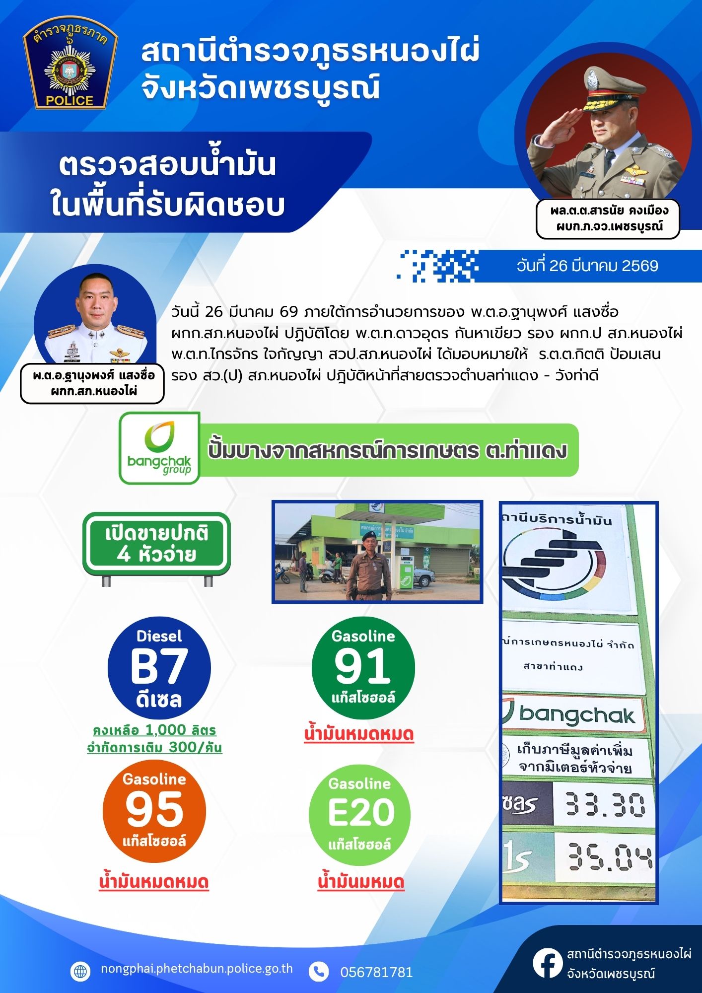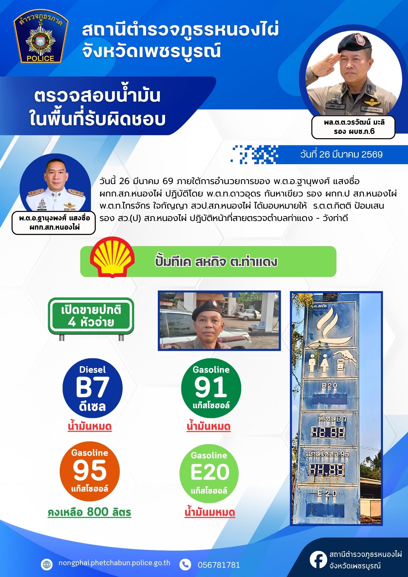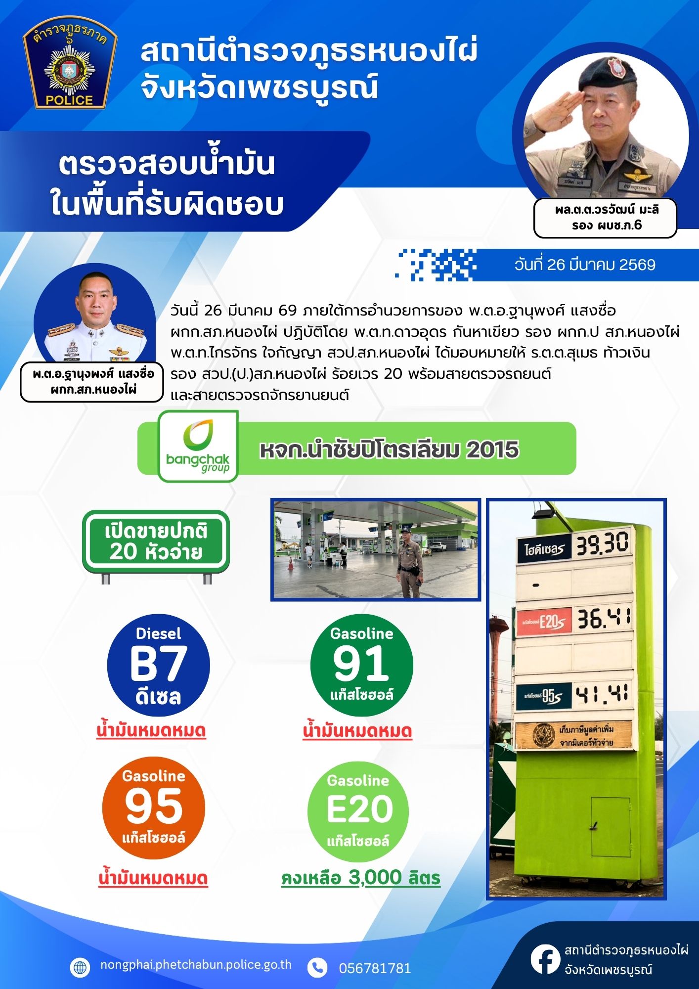 ด้วยความห่วงใยในการเดินทางของพ่อแม่พี่น้องประชาชน สภ.หนองไผ่ ได้รวบรวมข้อมูลปริมาณน้ำมันคงเหลือจากสถานีบริการน้ำมันในเขตรับผิดชอบ เพื่อให้ทุกท่านสามารถวางแผนการเดินทางและสำรองเชื้อเพลิงได้อย่างสะดวกครับ