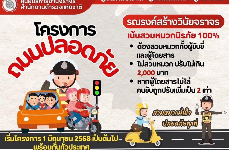 โดยเฉพาะการสวมหมวกนิรภัยของผู้ขับขี่และผู้โดยสารรถจักรยานยนต์ต้องปฏิบัติตามกฎหมาย 100% ทั้งนี้ ตามพระราชบัญญัติจราจรทางบก มาตรา 122 กำหนดให้ผู้ขับขี่รถจักรยานยนต์ และคนโดยสารรถจักรยานยนต์ ต้องสวมหมวกนิรภัยเพื่อป้องกันอันตรายในขณะขับขี่และโดยสารรถจักรยานยนต์ หากฝ่าฝืนมีโทษปรับไม่เกิน 2,000 บาท และมีโทษปรับเป็น 2 เท่า หากผู้ขับขี่รถจักรยานยนต์ขับขี่ในขณะที่คนโดยสารรถจักรยานยนต์มิได้สวมหมวกนิรภัย โดยให้บังคับใช้กฎหมายจราจรทางบกและกฎหมายที่เกี่ยวข้องกับรถหรือการใช้ทางบนถนนดังกล่าวอย่างเข้มงวด เพื่อป้องกันการเกิดอุบัติเหตุและสร้างความปลอดภัยในการสัญจร โดยเริ่มดำเนินการตั้งแต่วันที่ 1 มิถุนายน 2568 เป็นต้นไป