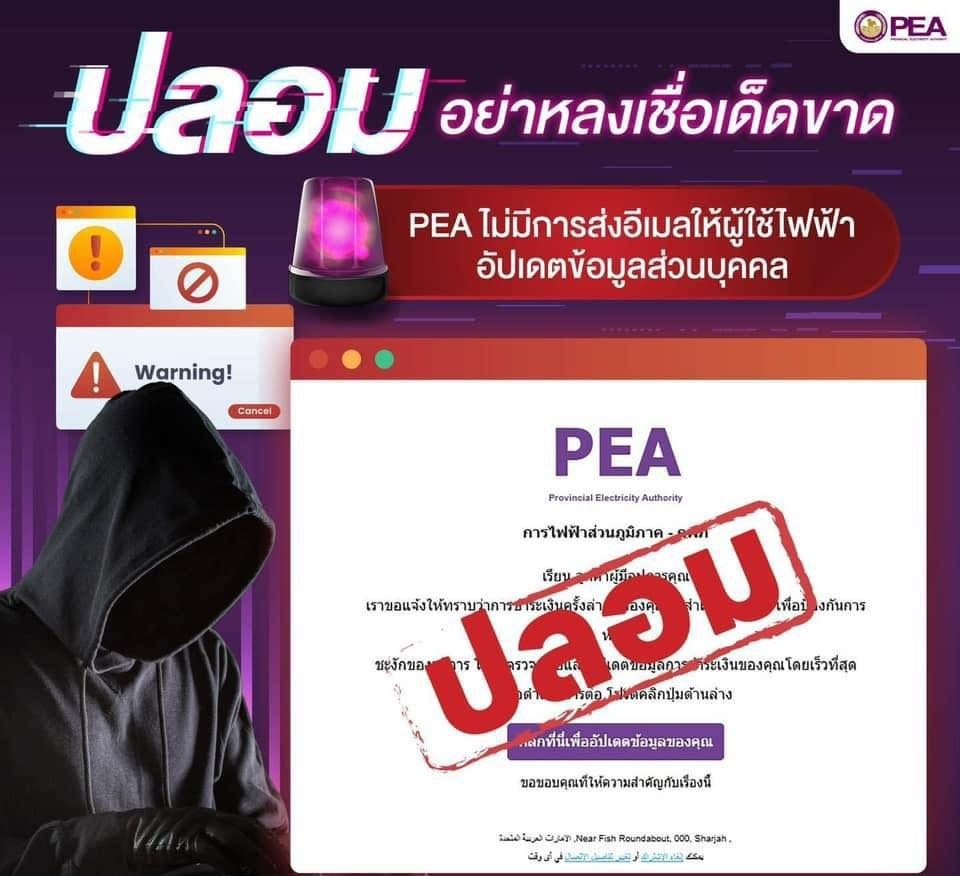 PEA เตือนระวังกลุ่มมิจฉาชีพ ส่งอีเมลให้ผู้ใช้ไฟฟ้าอัปเดตข้อมูลส่วนบุคคลการไฟฟ้าส่วนภูมิภาค (PEA) ขอเ