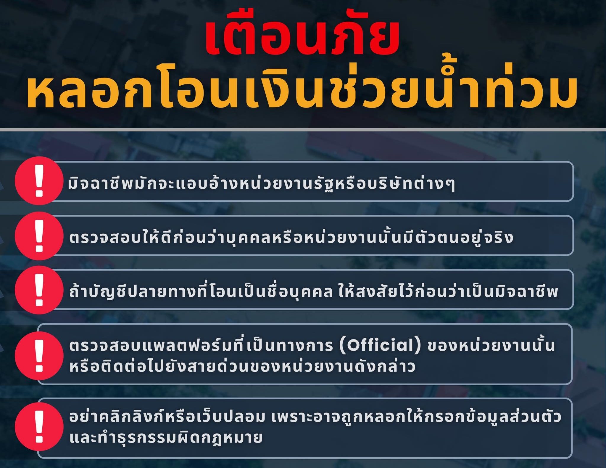 เตือนภัยหลอกโอนเงินช่วยน้ำท่วม“มิจฉาชีพ” ตีเนียนหลอกลวงให้โอนเงินช่วยผู้ประสบภัยน้ำ